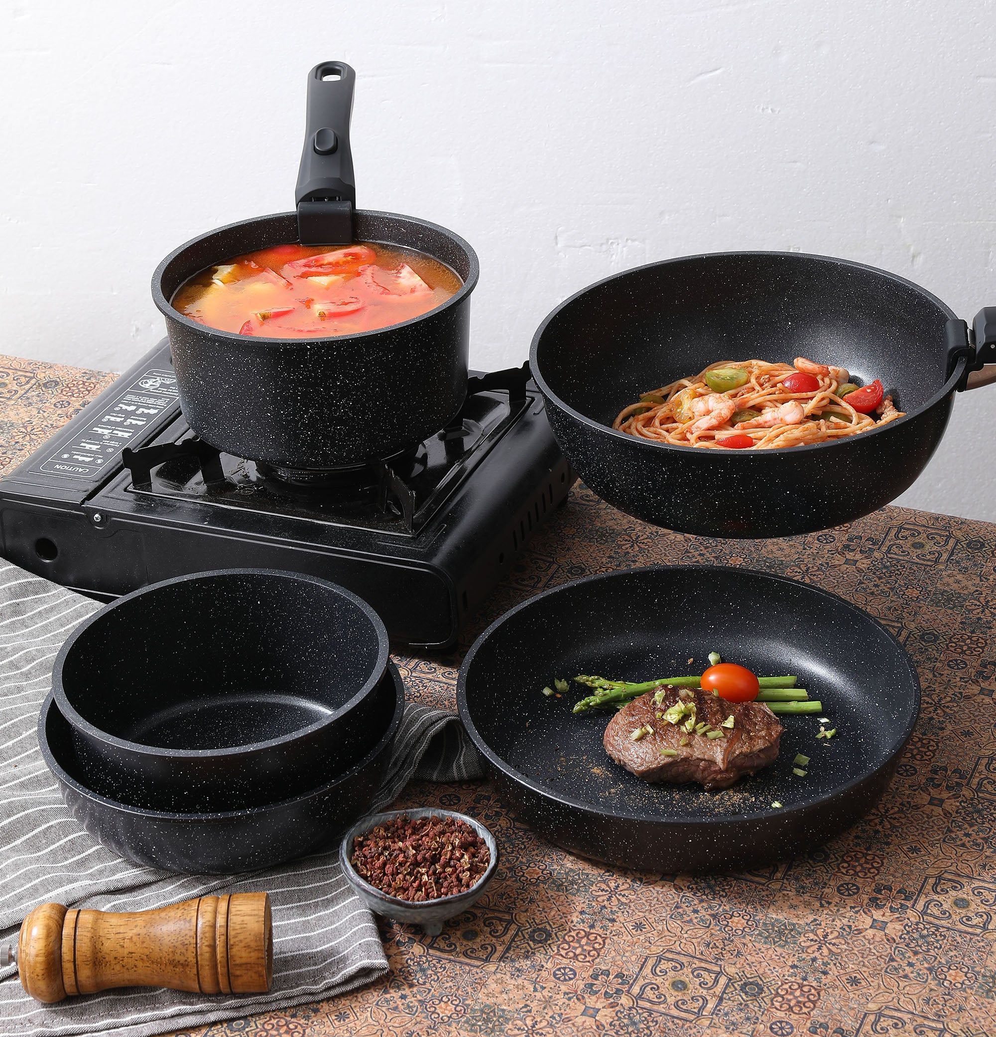 Black Pots and Pans Set Non Stick Removable Handle Ceramic Cookware Set Nonstick 9Pcs Dishwasher Oven Safe RV Kitchen Cooking Set Stackable Induction Cookware (Black, 9Pcs)