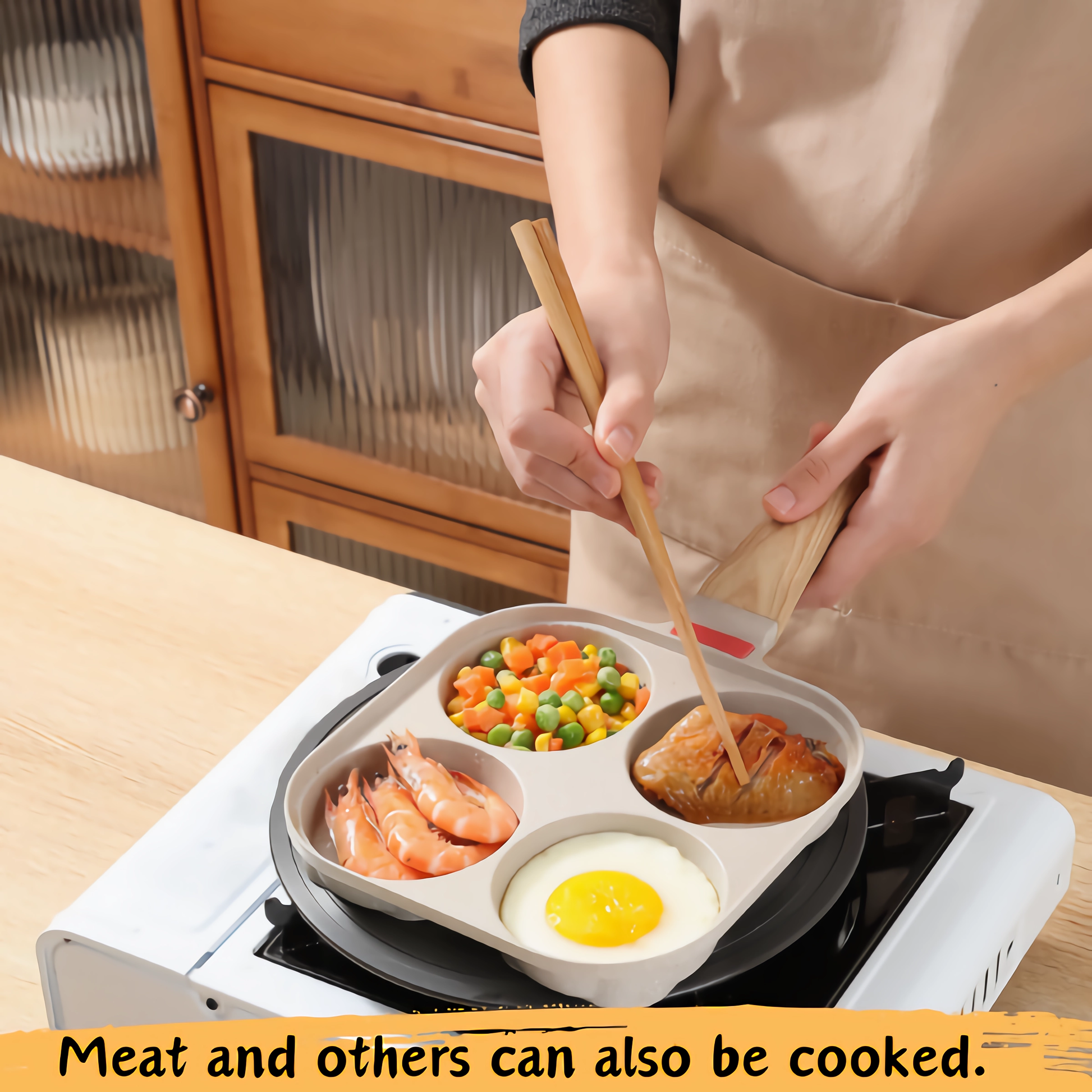- EASY FOR BREAKFAST: The pan heats quickly and evenly everywhere. The simple method is to constantly mix the scrambled eggs and let them sit for a few minutes until they form an appropriate shape. When the pan is hot, the red silicone piece over the handle turns white, It has the effect of reminding the temperature. NOTE: Do not cook for too long when the temperature is high; if you do not use all four holes and there are holes with no supplies, pour water to keep the pan secure!